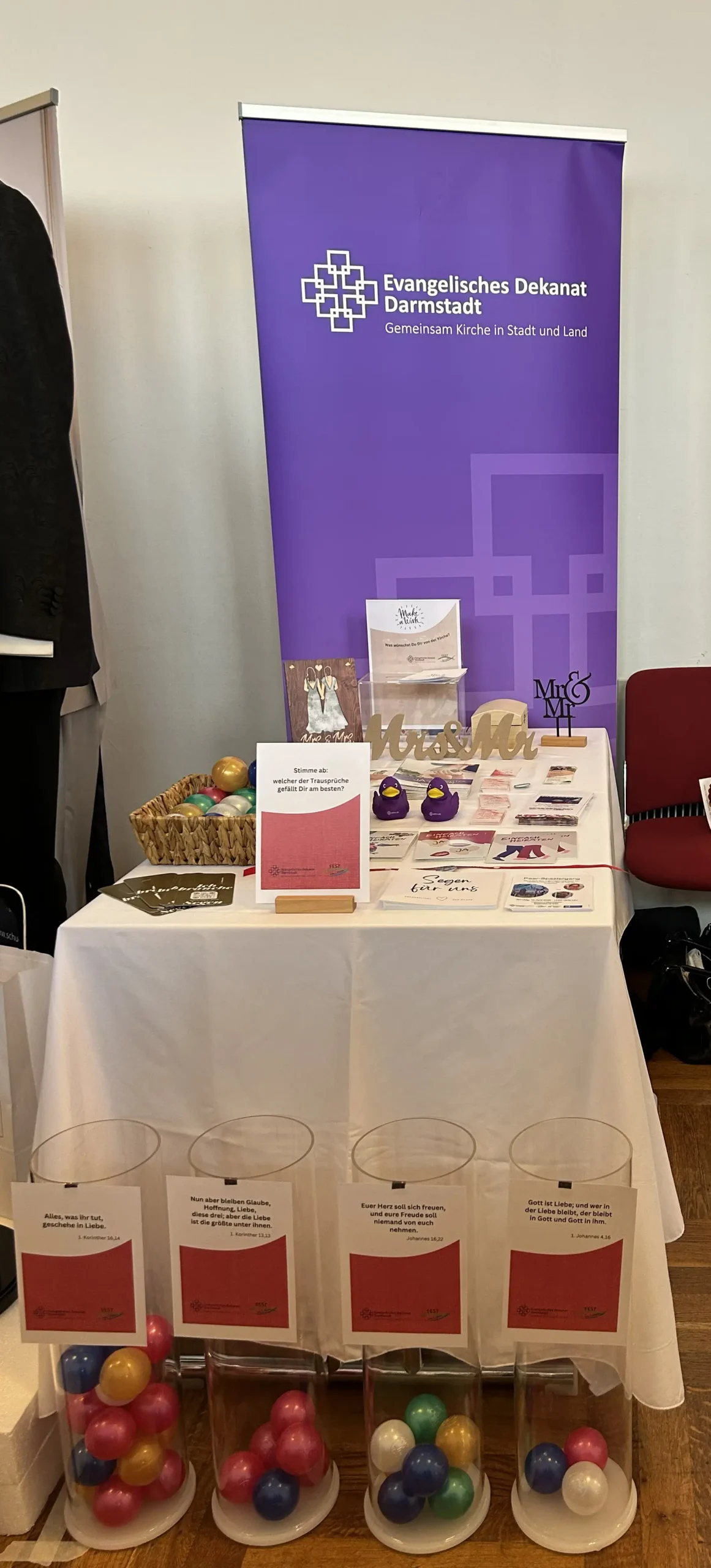 Am Wochenende waren wir auf der Hochzeitsmesse in der Orangerie, haben Fragen zur kirchlichen Trauung beantwortet und Gespräche geführt. Viele Menschen haben an unserem Trauspruchvoting teilgenommen und einige haben sich mithilfe unseres Trauspruch-(Kaugummi)automaten für ihren Trauspruch inspirieren lassen. Wir hatten Segen für Paare und Schokolade und Infos über Veranstaltungen dabei und sind vielen interessierten Menschen begegnet, haben bekannte Gesichter aus dem letzten Jahr wiedergesehen und wieder tolle Aussteller*innen kennengelernt!